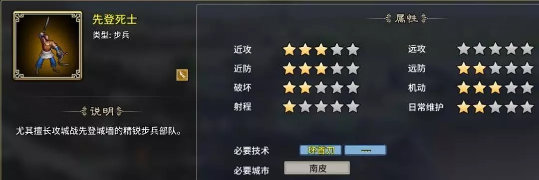 6、先登死士:攻城神步兵,率先登上城墙作战,只适合攻城上墙,需要环首刀支持,南皮特性开启,只有2个虎符。