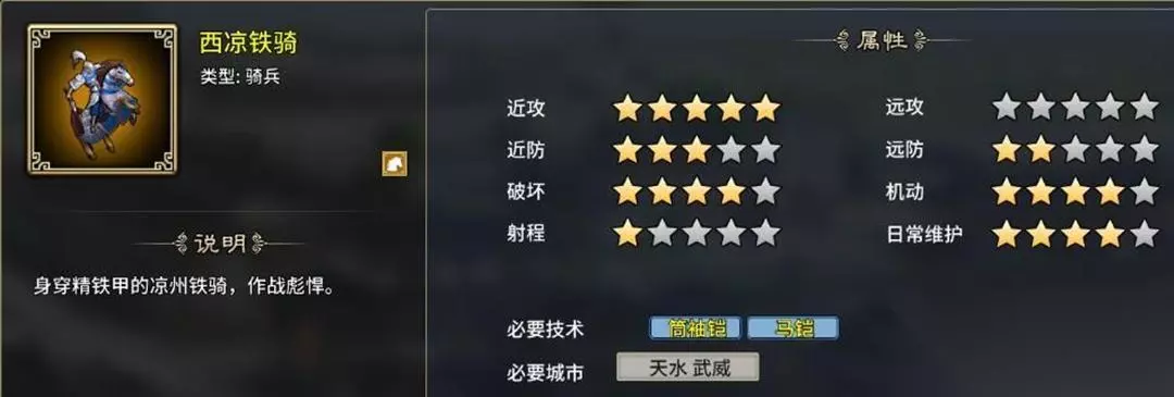 二、骑兵系: 1、西凉铁骑:西北最强战力,轻松消灭中低级步兵,超强攻击力,价格昂贵,需要筒袖铠、马铠支持,武威、天水特性开启,4个虎符。