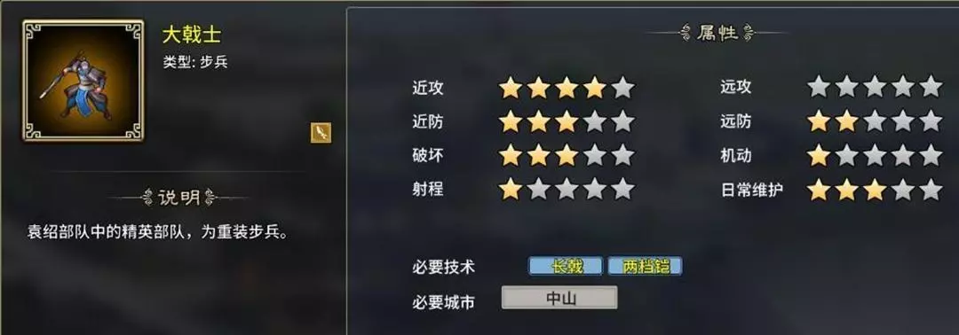 5、大戟士:骑兵克星加强版,攻击比白耳精兵更高,比较克制部分骑兵,双防偏低,需要长戟、两档铠支持,中山特性开启,只有2个虎符。