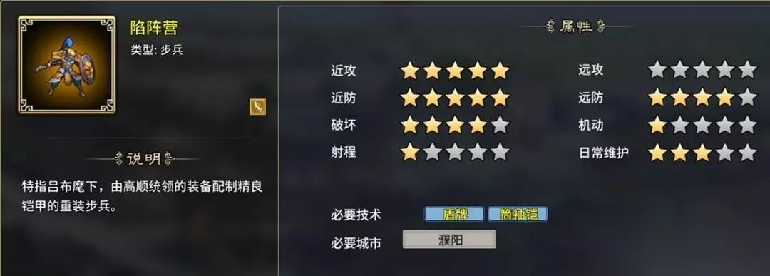7、陷阵营:天下无敌,变态伤害,变态防御,需要盾牌、筒袖铠支持,濮阳特性开启,只有1个虎符。