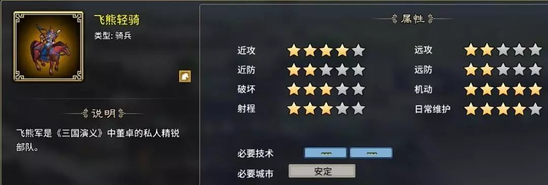 2、飞熊轻骑:奇袭专属,直接绕过大部队干主将,行动力非常强,远防低且价格高昂,安定特性开启,只有3个虎符。