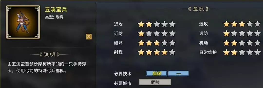 3、五溪蛮兵:肉搏能力比轻步兵高,范围伤害大,适合守城,低防御,需要盾牌支持,武陵特性开启,2个虎符。