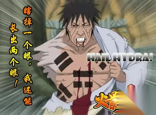 木叶之根 木叶的“根”想必是火影中颇有争议的一个组织,这个组织虽然时不时会在剧情中出现,但对他们的直接描述并不多,后来也还是通过佐井才慢慢揭开面纱。“根”之人,没有名字,没有感情,没有过去,亦不会有未来,他们的生命只是为了任务而存在,为了完成任务可以不择手段。但同为“根”的大和和佐井,最后都跟着我大鸣人逐渐变为一个有血有肉有感情的忍者。 大和:好久不见,大家还好吗~ HAIL HYDRA! 团藏:我瞎了一个眼,还能长出两个眼!HAIL HYDRA!