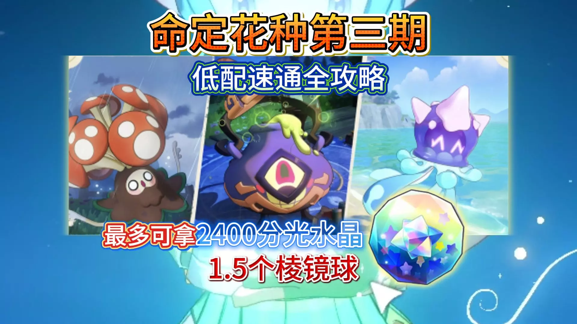 命定花种第3期,无需粉尘培养0星精灵即可拿下2100分光水晶,使用精灵如下: 琉璃水母-古卷执政官 九幽菇-画间沉铁兽 嘟嘟锅-落陨星兔 感谢大家的支持!