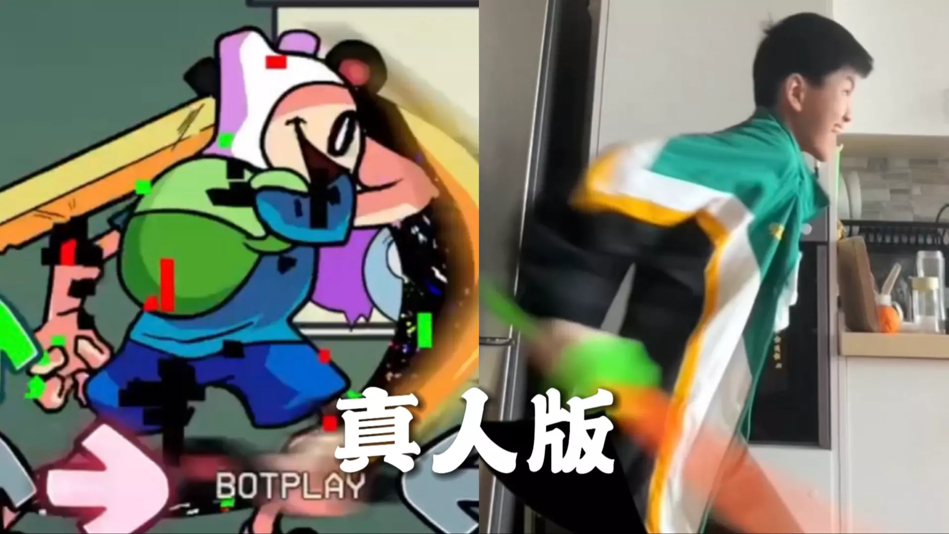 这是一则《Friday Night Funkin'》的真人演绎视频,还原了VS opposition expunged模组内容,视频里真人模仿游戏角色动作,呈现出趣味的真人版FNF游戏演绎内容。