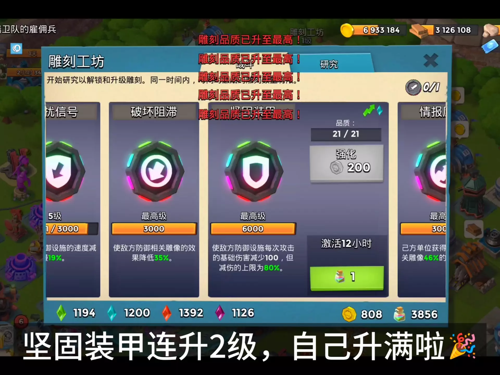 这是一篇《海岛奇兵》的雕刻机机制讲解内容,展示了雕刻工坊的研究界面、雕刻属性、等级信息,还介绍了雕刻的切换、品质提升等机制,帮助玩家了解雕刻机的运作与使用。