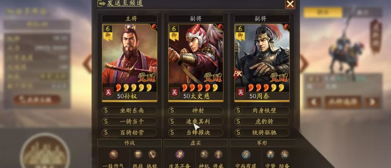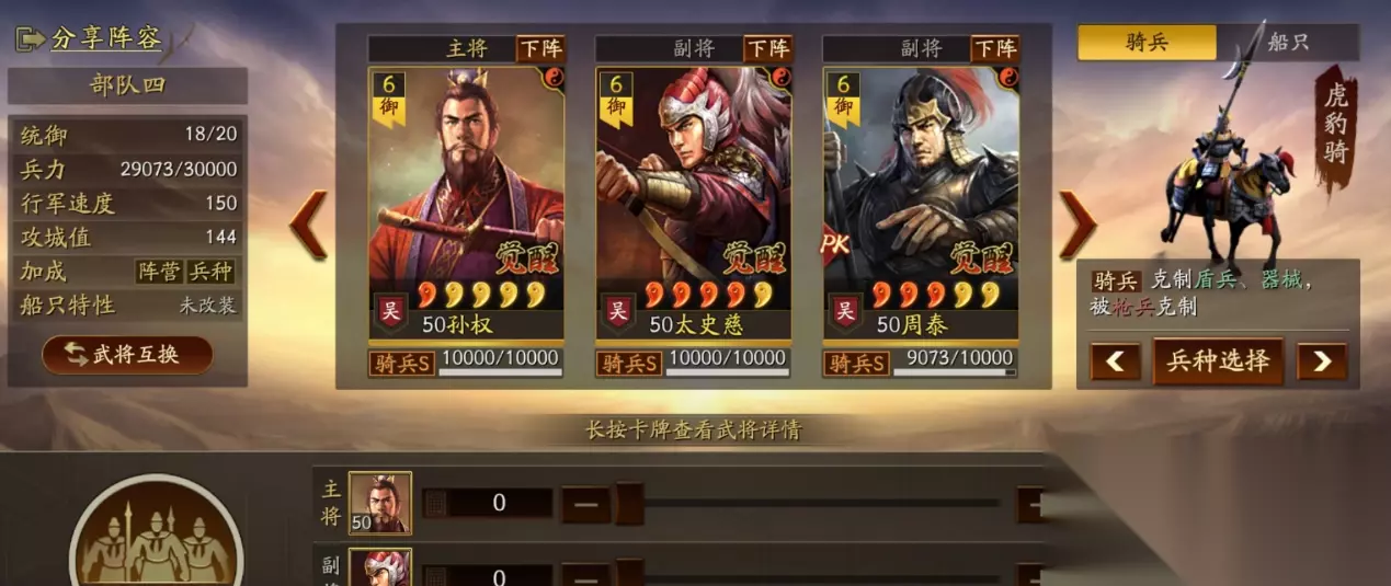 这是当前版本孙权最主流的最强配队,以“孙权+凌统+周泰”为核心,搭配虎豹骑和锋矢阵,形成爆发与生存兼备的骑兵体系,尤其克制蜀弓、太尉盾等主流队伍。 1. 阵容配置(顶配版) - 主将:孙权(核心输出):战法【一骑当千】+【百骑劫营】(备选:暴戾无仁);兵书【一鼓作气】+【胜战】+【执锐】;加点全武力/主武力副速度。解析:一骑当千与百骑劫营完美适配突击体系,触发连击后一回合可打出4次普攻,单次伤害可达3000+,配合破阵效果直接穿透敌方防御。 - 副将:凌统(辅助核心):战法【裸衣血战】+【当锋摧决】;兵书【胜而益强】+【胜战】+【武略】;加点全速度(需快于孙权10点以上)。解析:提供先攻、必中及增伤,确保孙权开局就能稳定叠状态,当锋摧决可破解敌方规避与防御被动,进一步拉满爆发上限。 - 副将:周泰(承伤核心):战法【锋矢阵】+【虎豹骑】;兵书【守而有道】+【守势】+【防备】;加点全统率。解析:承担全队伤害,配合锋矢阵可为孙权提供65%以上增伤,虎豹骑提升10%突击战法发动率,形成“增伤+承伤”双保障。 2. 平民平替方案(无凌统/缺核心战法)