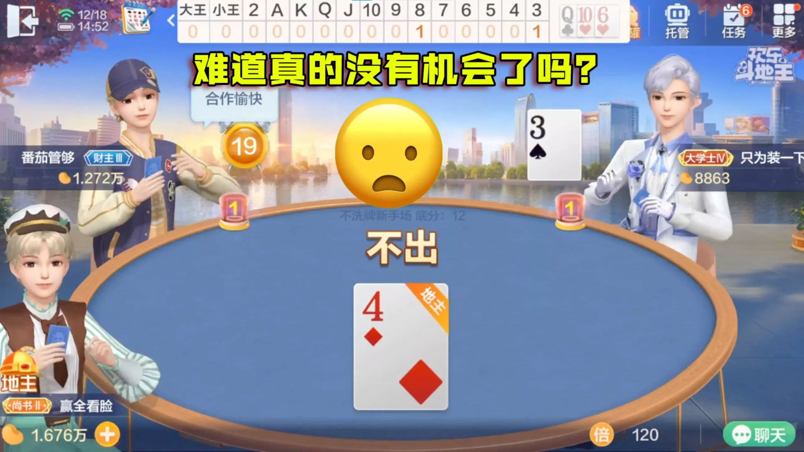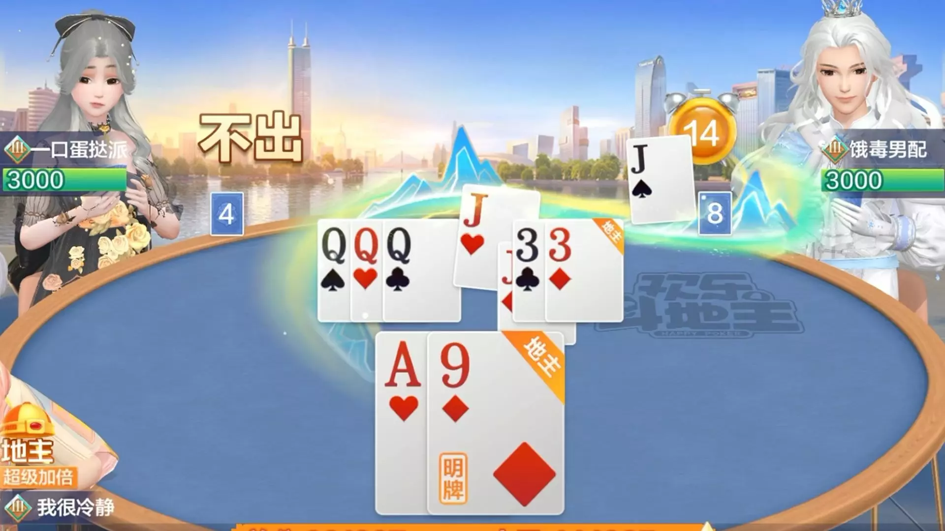 这是欢乐斗地主的对局分享,玩家作为地主持有QQ、三个10、三个8的牌型,对局中两名农民玩家互相吐槽拌嘴,场面有趣,展现了欢乐斗地主的趣味对局氛围。