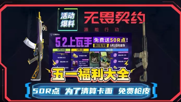 无畏契约手游推出多项福利活动:4.30-5.28可组队免费兑换戍卫枪皮、10R点;5月2日的R点之约活动,完成对局、拉人可抽奖,抽满10次得30R点等奖励;还有限时联动可领288R点、紫金爪刀等奖励,另有礼包码可兑换福利。