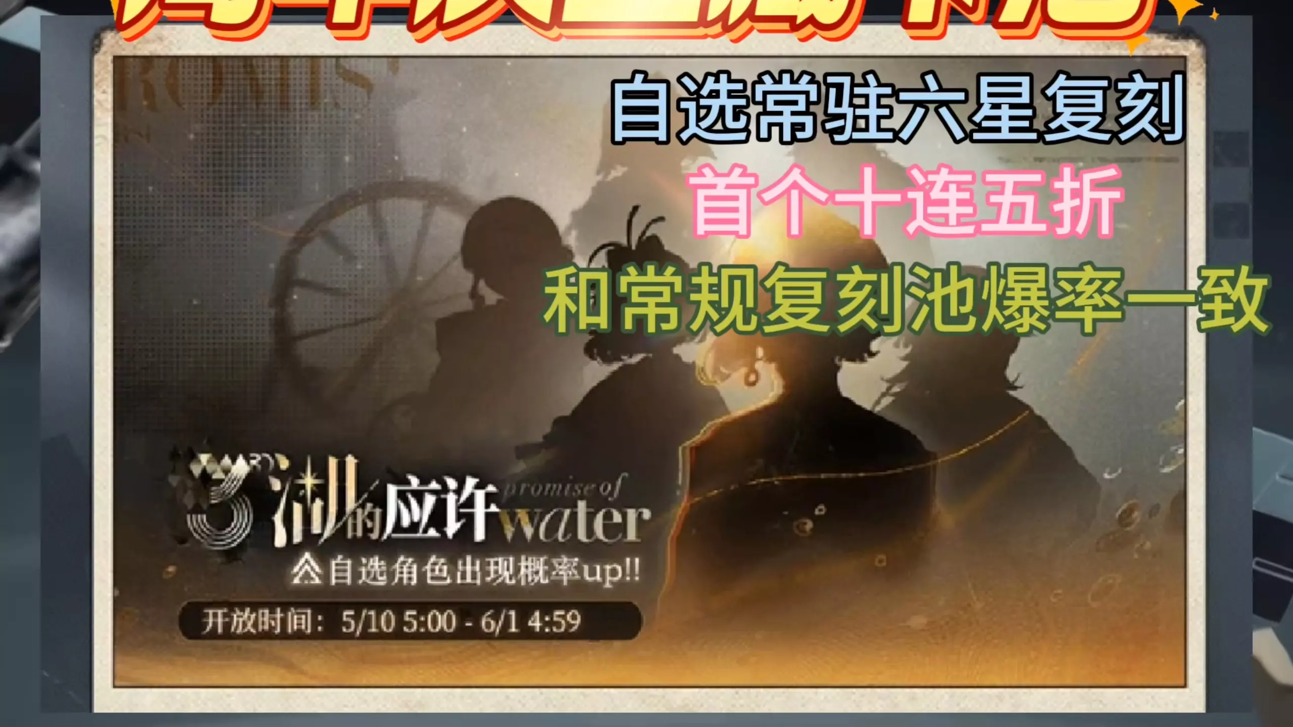 这是游戏《重返未来:1999》三周年的「湖的应许」限时征集抽卡活动介绍,自选范围为1.0-3.4的六星角色,玩家可锁定1位六星角色提升获取概率,首次十连仅需5枚独一律,该活动保底单独累积不共享,结束后保底次数清零。