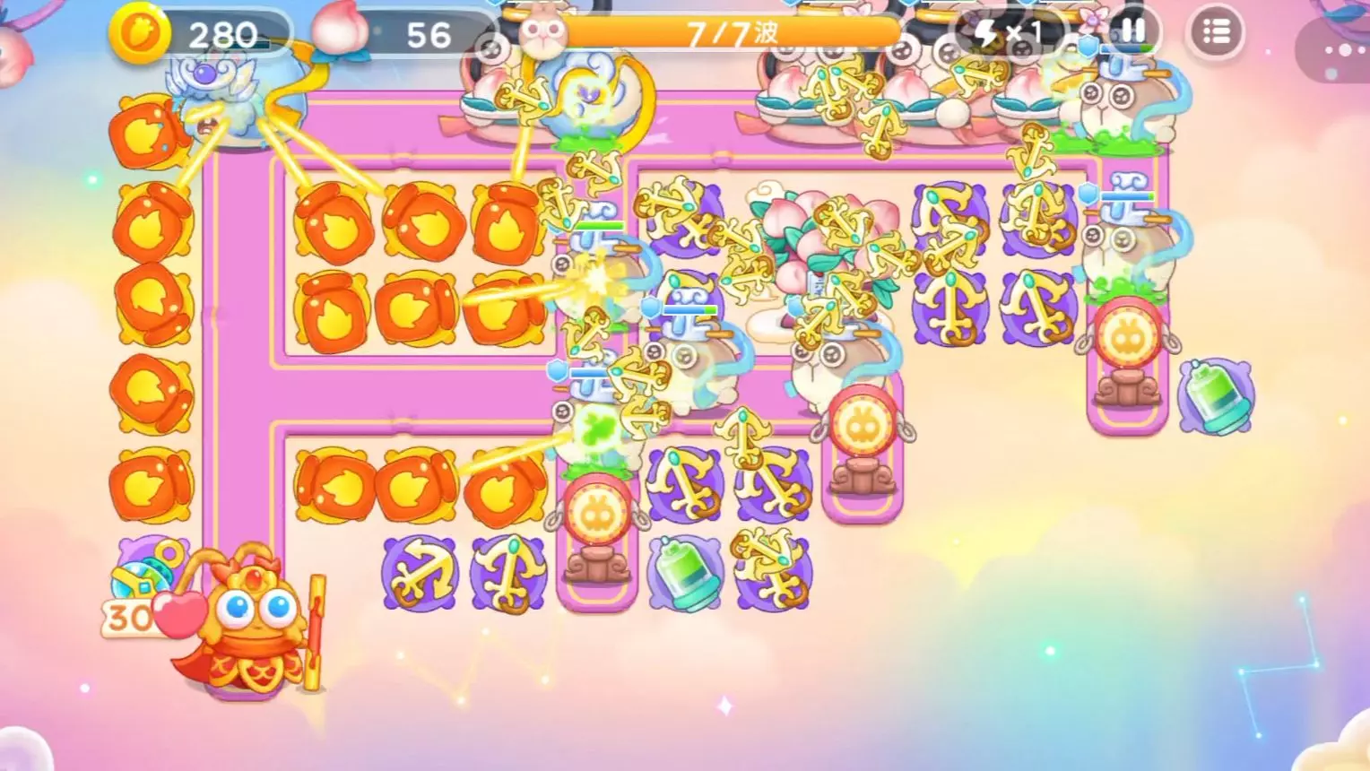 非常简单的一张图,后期只需注意仙女兔,有兔子进入魔法球的攻击范围就1倍速。最后用泡泡留仙女兔,最多留到下方的丁字路口。