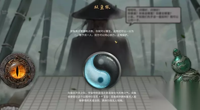 选完天赋,接下来是三神器的选择,这三样东西会陪你很久。对于刚上手的玩家,我比较推荐双鱼佩,这东西实在,等于多给你几条命,前期不熟悉BOSS技能容易暴毙,有它容错率高,能让你多练习几次。另一个好选择是炼妖壶,它能抓妖兽当帮手,打架时让宠物先上,你在后面输出,安全又省心,而且抓到的宠物后期还能化形,挺有意思。至于昊天眼,功能是偷学敌人技能,但前期咱们属性低,偷来的技能威力也小,还有点看脸,可以等以后玩明白了再尝试。