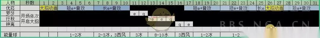 如图所示,理想情况下这个循环模型能够获取5-8冰球(前台),3冰球(后台),8-10水球(后台),6西风(后台),(此外忽略难以计算数量的钟离岩球):也就是保底5*3+3*3*0.6+8*1*0.6+6*2*0.6=33能量,最多43能量(补上漏掉的长e能量是39-52能量) 也就是说优菈至少需要200%充能才能保证上述循环,这就有点尴尬了。 因此需要让罗莎在循环内至少再打1次e,再获取3冰球和至少3西风球,并切回优菈吃球——这里是15能量,也就是说在这样的情况下优菈还是需要125%-148%充能,但至少是可以接受了 考虑到实战中的其他能量获取以及不稳定的钟离岩球,充能需求可以进一步下降(换凯亚可能会更舒服一点,毕竟凯亚e技能对冰冻目标能获取5冰球) 2.优菈+皇女+北斗+冰猫