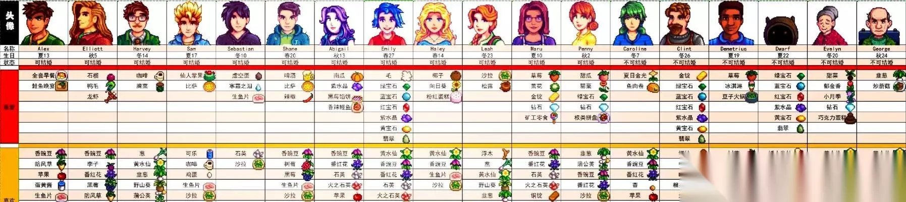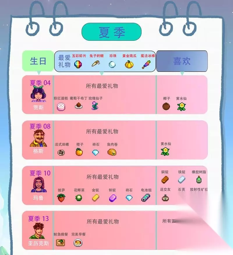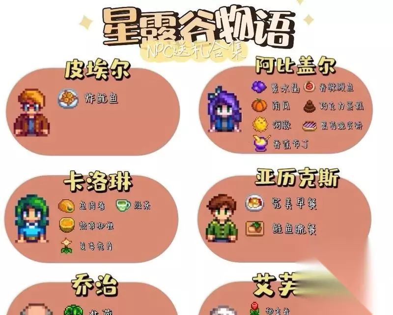 2.海利:追求奢华生活的贵族 海利是一个追求奢华生活的贵族,他喜欢收到一些昂贵的礼物,比如金属、宝石和高级饰品等。但他对农场主种植的普通蔬菜或土产没有太大兴趣。 3.艾利斯:喜欢温暖的礼物 艾利斯是一个冷静、温和的角色,他喜欢收到一些温暖的礼物,比如羊毛制品、厚实的衣物等。同时,他也喜欢收集一些具有文化气息的物品,比如书籍、艺术品等。 4.马维尔:热衷冒险的冒险家 马维尔是一个热衷冒险的冒险家,他喜欢收到一些与探险相关的礼物,比如矿石、宝石、探险装备等。他还对自然界的珍奇事物很感兴趣,比如远古骨骼、动植物标本等。 5.梅罗丝:热爱宠物的动物保护主义者 梅罗丝是一个热爱宠物的动物保护主义者,她喜欢收到一些与动物相关的礼物,比如宠物食品、宠物用品、动物图鉴等。她还对环境保护和自然生态有着浓厚的兴趣。 6.艾米利:热爱研究的科学家 艾米利是一个热爱研究的科学家,他喜欢收到一些与科学研究相关的礼物,比如实验器具、化学物品、科学书籍等。他还对植物学、天文学等领域有着浓厚的兴趣。 7.露娜:享受孤独的艺术家 露娜是一个享受孤独的艺术家,她喜欢收到一些具有艺术性的礼物,比如绘画作品、乐器、音乐CD等。同时,她也对自然景观和四季变化有着特别的情感。 8.格斯:热衷体育运动的教练 格斯是一个热衷体育运动的教练,他喜欢收到一些与运动相关的礼物,比如运动器材、体育用品等。他还喜欢一些有竞争性的游戏和活动。 9.洛伊:追求平衡的瑜伽教练 洛伊是一个追求平衡的瑜伽教练,他喜欢收到一些与瑜伽和冥想相关的礼物,比如瑜伽垫、冥想音乐、身体护理产品等。同时,他也喜欢一些能够帮助放松身心的物品。 10.海蒂:喜欢美食的美食家 海蒂是一个喜欢美食的美食家,她喜欢收到一些与美食相关的礼物,比如食材、烹饪器具、菜谱等。她也喜欢收集各种特色的餐具和餐饮文化相关的物品。 11.芭芭拉:热爱音乐的音乐老师 芭芭拉是一个热爱音乐的音乐老师,她喜欢收到一些与音乐相关的礼物,比如乐器、音乐CD、音乐会门票等。同时,她也喜欢收集各种音乐文化相关的物品。 12.阿特:对工艺品情有独钟的艺术家 阿特是一个对工艺品情有独钟的艺术家,他喜欢收到一些具有艺术性的礼物,比如雕塑、陶瓷制品、绘画作品等。同时,他也对各种手工艺品和传统工艺技术有着浓厚的兴趣。 13.麦克斯:热衷动漫的二次元爱好者 麦克斯是一个热衷动漫的二次元爱好者,他喜欢收到一些与动漫、游戏相关的礼物,比如漫画、手办、游戏周边等。 14.卡洛琳:喜欢鲜花的花艺师 卡洛琳是一个喜欢鲜花的花艺师,她喜欢收到一些与花卉相关的礼物,比如花种、花盆、花艺工具等。同时,她也喜欢研究和欣赏各种不同种类的花卉。 15.沃利:追求平静的修行者 沃利是一个追求平静的修行者,他喜欢收到一些能够帮助修行和冥想的礼物,比如香薰、佛珠、冥想音乐等。同时,他也喜欢收集各种有精神意义的物品。 不同的角色对不同类型的礼物有着不同的偏好,了解他们的喜好可以更加有效地提升好感度。
