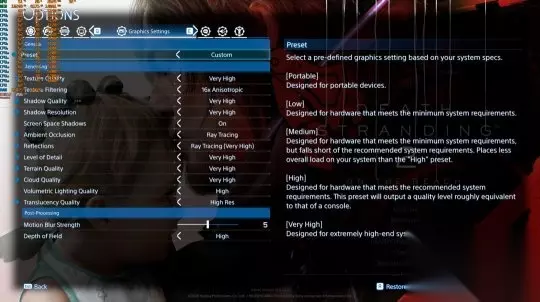 测试平台配置: 系统:Windows 10 64位 CPU:AMD Ryzen 9 7950X3D 内存:32GB DDR5 6000MHz 驱动:GeForce 595.76,Radeon Adrenalin Edition 26.3.1 显卡:AMD Radeon RX 6900XT RX 7900XTX RX 9070XT RTX 2080Ti RTX 3080 RTX 4090 RTX 5080 RTX 5090 《死亡搁浅2》PC版开发商——SIE旗下工作室Nixxes为游戏添加了大量可调整设置。PC玩家可以调整阴影、纹理、地形、云层等的质量。游戏还支持所有PC图像增强技术,例如NVIDIA DLSS 4、AMD FSR 4.0和 Intel XeSS。此外,本作首次在采用Decima引擎的游戏中支持光线追踪技术。