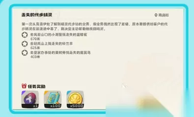 接下来就是寻找三只的走失精灵,跟着地图的指引即可,一点都不会绕路,先来到小湖边上去找蓝蝶鲨,就在浅滩边上一眼就可以看到,然后来到皇家办事处,在果树的边上就可以看到有一个魔翼鸟。别看他很爱飞,站在树下面就可以轻松的交互,最后就铃兰羊,山坡上的草地就是他休息的地方,山之精灵位置都是比较显眼的,跑一趟全部都能够找齐。这里也给大家提醒一下,在找的时候别忘记要带上魔力猫,还有音速犬。