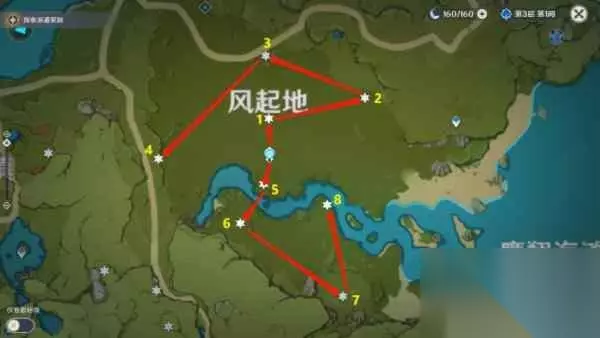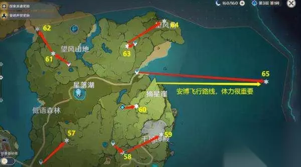 望风山地、望风角、摘星崖、千风神殿、低语森林、誓言岬57-65 57、石柱上。 58、石柱上。 59、还是石住上。 60、地上,两个石坡的缝里。 61、空中,旁边最高的树。 62、悬崖下的平台。 63、空中,旁边的塔。 64、悬崖下一点,注意看。 65、空中,收集风精灵,过去的路线可以看图(红线为凯亚铺冰,黄线为安博飞行)。 65、还有一个是前置任务里在宝箱里的。