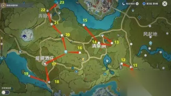 奔狼领、晨曦酒庄、清泉镇9-23 9、高空,爬旁边的大树。 10、空中,附近风精灵。 11、悬崖下一点。 12、悬崖。 13、房顶。 14、悬崖空中,收集附近风精灵。 15、河中,从旁边最高的悬崖飞过去或凯亚铺冰。 16、高空,收集风精灵。 17、房顶,从正门爬会容易。 18、高空,东方向有风精灵和风杯开启。 19、河中,最高的树或凯亚铺冰。 20、悬崖底一点点。 21、石柱上,用火。 22、空中,旁边的树或悬崖上下来。 23、树上。