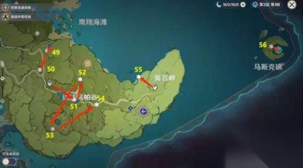达达乌帕谷、马斯克礁49-56 49、地上。 50、空中,收集风精灵。 51、交叉的大树枝上,完成任务探索剑冢封印(旁边的研究真对话开启任务。附近3个营地有火、冰、雷的杯激活)。 52、高空,悬崖上飞过去。 53、最大的丘丘帐篷里。 54、石柱上,用高的角色(小心掉下去)。 55、悬崖下的平台。 56、深渊门上,誓言岬的悬崖角处有三个仙灵台的机关,收集周围的仙灵。