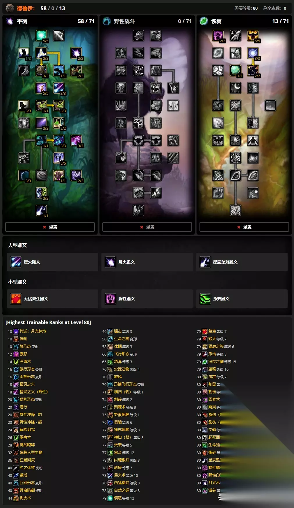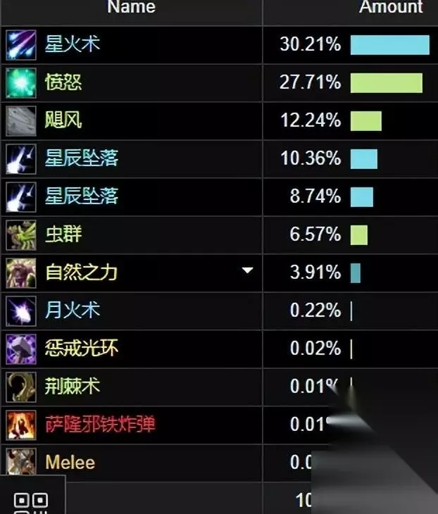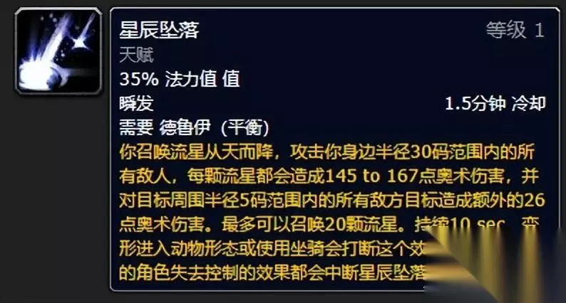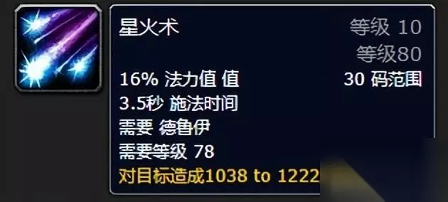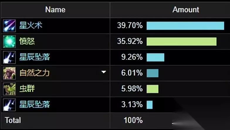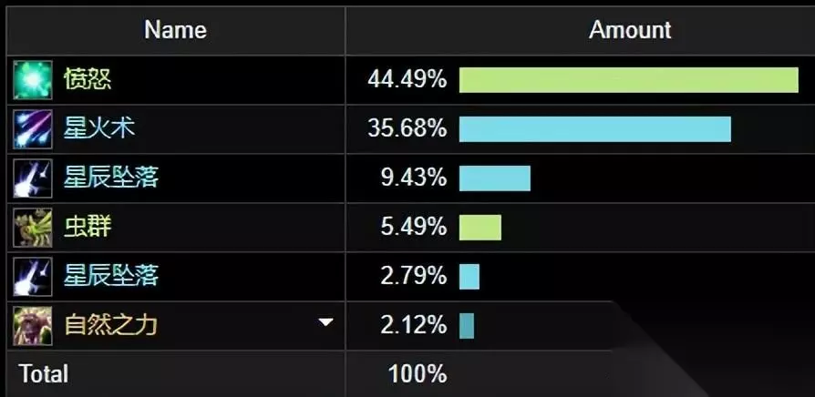 单体输出级别星火术,愤怒和星辰坠落占据大部分的输出循环,其它技能为辅助。