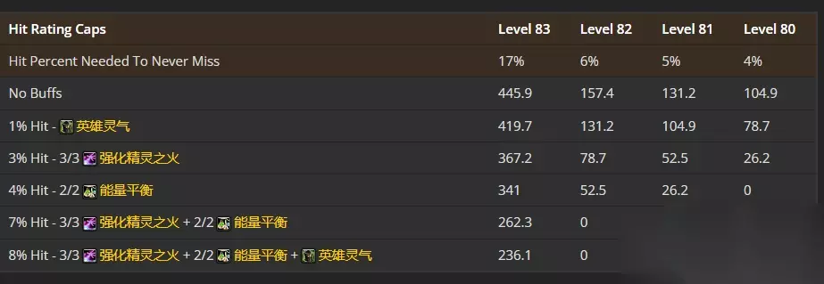 有buff和没buff的装备命中等级参考(满命中率是17%)