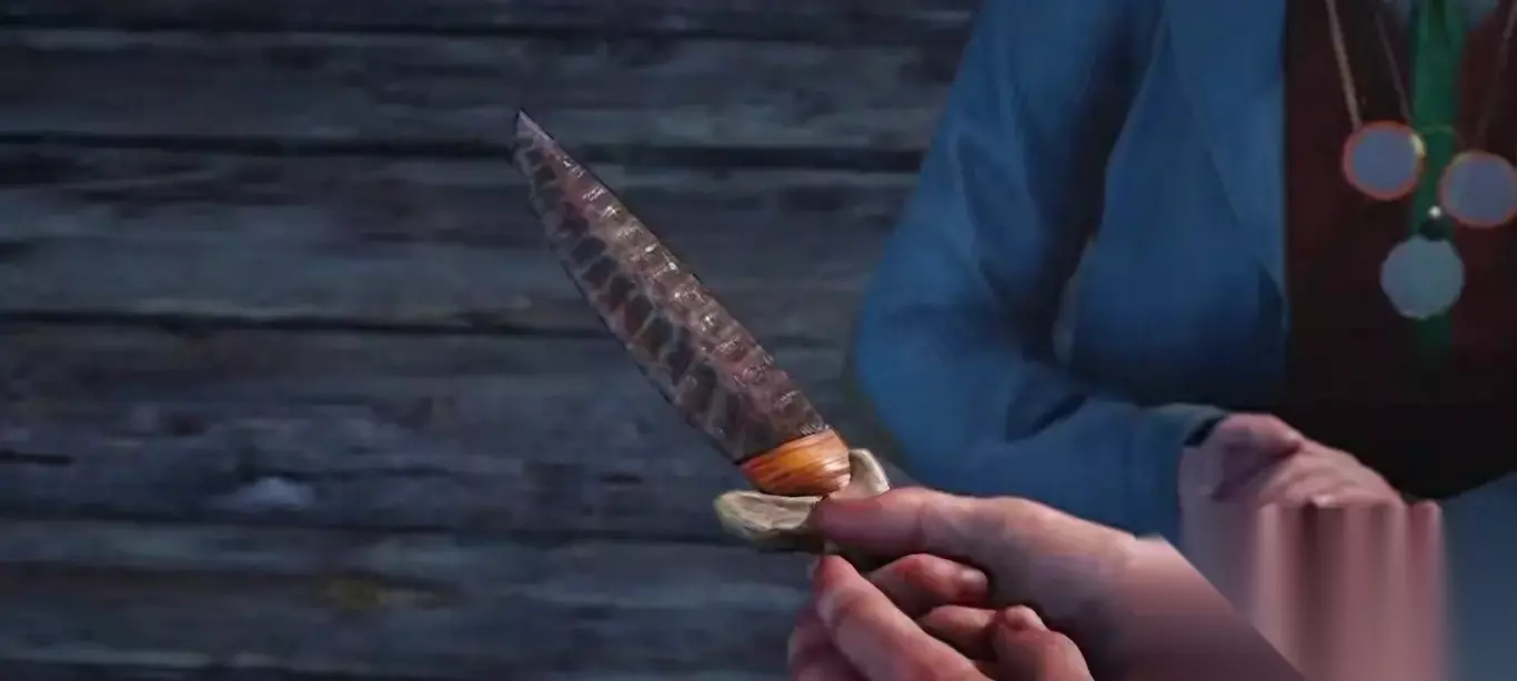 这把刀是用剑龙的骨头制成的,极具收藏价值。 收集开始前,要来到这里接一个陌生人任务,触发恐龙骨收集。