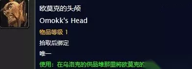 《魔兽世界》怀旧服游戏中欧莫克的头颅可以放置在黑石塔下层乌洛克贡品堆处的长矛上,然后可以召唤出boss乌洛克,玩家击杀乌洛克后100%掉落瓦罗什的魔精,是任务“乌洛克”所需要的目标道具。