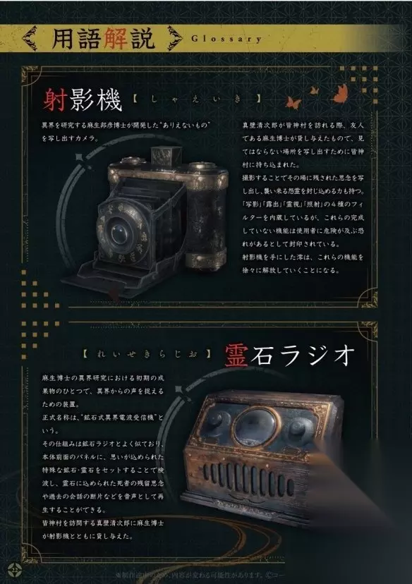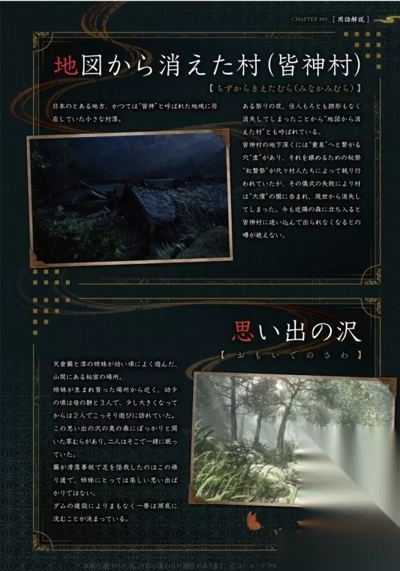 资料集不仅收录了为系列演唱经典主题曲的歌手天野月的深度专访,探寻音乐与恐怖美学之间的共鸣;还包含了导演柴田诚对“绘镜”系统的亲自解说,从核心设计理念层面揭秘游戏中封印怨灵的关键仪式与视觉象征。