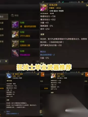 很多人对于防具如何选择有很大的疑问,有的人甚至想要制作机械牛副本的史诗套?那简直就是天方夜谭! 这套装备是「古拉德的火焰重甲」,单从名字看就知道很符合狂战士了!因为狂战士本身就是重甲精通! 古拉德这套史诗装备是以火属性为主,每一件装备都可以增加2-3点火属性强化,大概增加15点火强。套装属性增加33点火强、增加10%伤害、附加火属性攻击,同时攻击时会有5%几率产生爆炸! 可以这么说,这套装备就是狂战士首选防具,没有之一。 二、狂战士毕业武器推荐