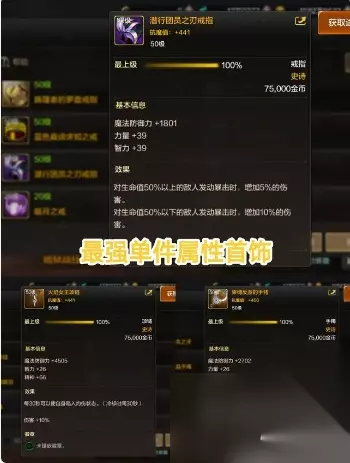 首饰套目前只有这一套最强,名为「蓝色真谛求知首饰」。这套首饰套单件首饰套增加3%魔法防御力,手镯20%概率增加10%伤害,属性还是不错的。 除此之外还有套装属性,只要获得这三件装备,伤害+10%、物理魔法攻击力+12%,可以说是非常恐怖的! 首饰套的选择比较多,接下来推荐一套更强的! 四、最强单件属性首饰