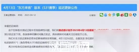 (以上是官方在4月12日10点发布的公告详情) 也即是说,明天包括新英雄姬小满,三款战令新皮肤和众多英雄的调整,都不会上线。 此外,各类榜单的结算时间也会随之延迟。 值得一提的是,如果S31新赛季定在下周四之后,那明天大家至少要打一局巅峰赛或者排位,不然,肯定会掉星或者掉分的,导致定榜段位有落差。