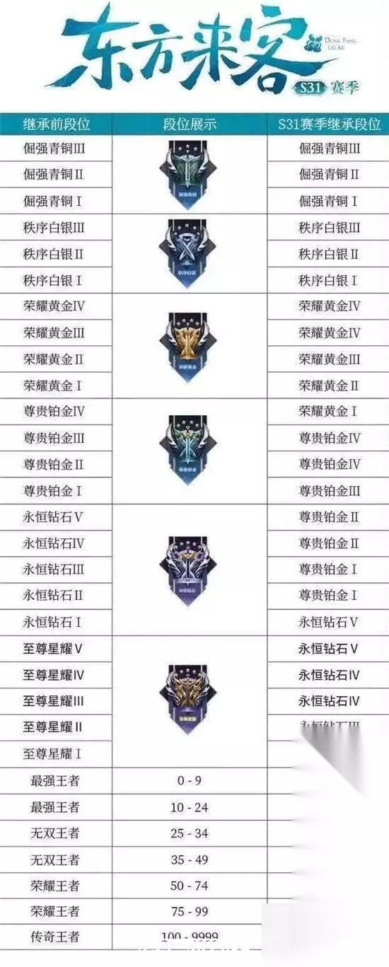 尤其是刚打上荣耀段位和2100分(或1800分)的同学,一定别忘记了。 当然,还没有冲上理想段位的同学,也还有一周左右的时间可以肝一肝。 (以上则是S31新赛季的段位继承图,想卡段位的同学最好在明天至更新前,打一局排位) 值得一提的是,在4月13日9点之后,将会全服发放排位加星卡和排位保星卡各一张,同时,还有英雄碎片和皮肤碎片各三个。