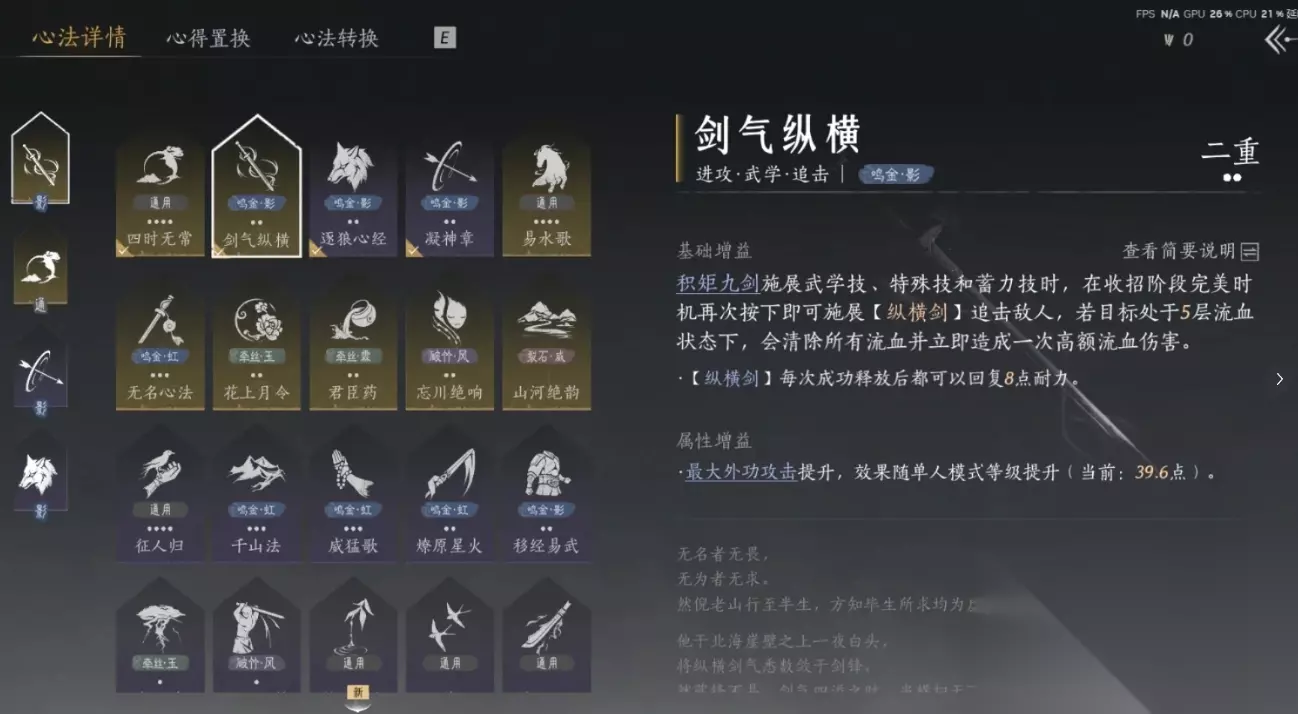 注意它的特殊技放不放纵横剑都有高额伤,仅在位移方面有所区别。它的蓄力技名为次二衡径数,能消耗耐力往前突进并对周边敌怪造成伤害。在突进的时候会进入隐身状态,自身不吃伤害并给敌怪附加流血。九枪的武学技名为愁无酒,能造成六段扫劈并积累连击点。点数小于五可得到滴水buff,大于五能得到涌泉。大于十的情况下,则可得到江流的增益。若是连击达到了十二,那能得到强效江流的增益。在这种状态下可增伤百分之二十五,特殊技造成伤害后还能回血。