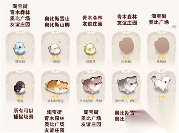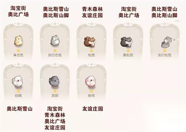 奥比岛手游宠物分布在哪里?在奥比岛手游中,宠物是非常重要的养成系统,游戏中也有很多的宠物,其中分布的位置非常的杂锁,很多萌新玩家不知道这些宠物都分布在哪里?为了帮助各位玩家获得更多的游戏乐趣,小编接下来将为大家分享一下宠物分布位置大全。 奥比岛手游宠物分布位置大全 1:一星宠物分布位置,黄仓鼠,灰白仓鼠,松鼠,果松鼠,灰白松鼠,白鸽,灰鸽,粉鸽;
