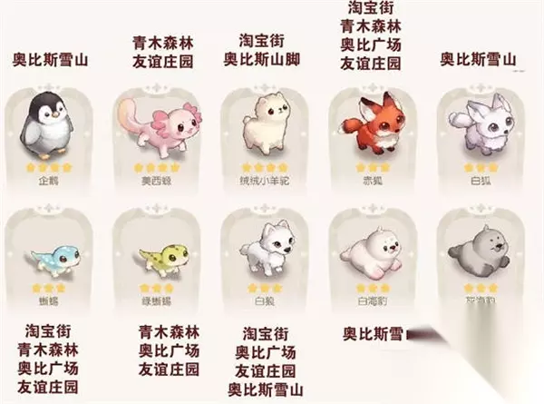 4:四星宠物,企鹅,蜥蜴,绿蜥蜴,白狼,小羊驼,赤狐,白狐,灰海豹;