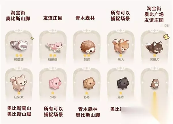 2:二星宠物,刺猬,粉蜥蜴,柴犬,黑柴犬,白柴犬,小猪,野猪,黑猪;