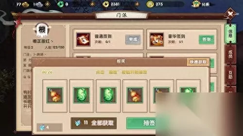 寻仙手游门派玩法大汇总,多种体验多种快乐。在我们的寻仙手游游戏中一个人玩游戏玩长了始终会觉得疲倦,那么我们不妨加入门派去寻找朋友。而且在门派里,有各种各样的玩法值得我们去体验。具体有哪些玩法体验呢?我们一起来看一下。 首先我们要介绍的是我们门派的签到系统,在这里我们每天点击签到然后就可以抽取物品,得到自己需要的,还有一个是豪华签到这个签到的奖励会很丰厚,我们消耗少量的玄玉就可以钱到了。这个只是小系统玩法接下来才是正题。 门派跑环 这个任务我们每天只能做一次,我们进入门派地图里在我们的跑环任务的NPC处接取就可以了,之后我们点击就可以自动传送到任务地点,就是不停的采集材料。1级门派整个任务阶段会采集五轮,门派每升一级就会增加一轮。 门派灵药 门派灵药是接取后获得长老指定的药材交给他就行了,着我们可以在交易行购买或者自己在摇钱树里摇下来。 摇钱树