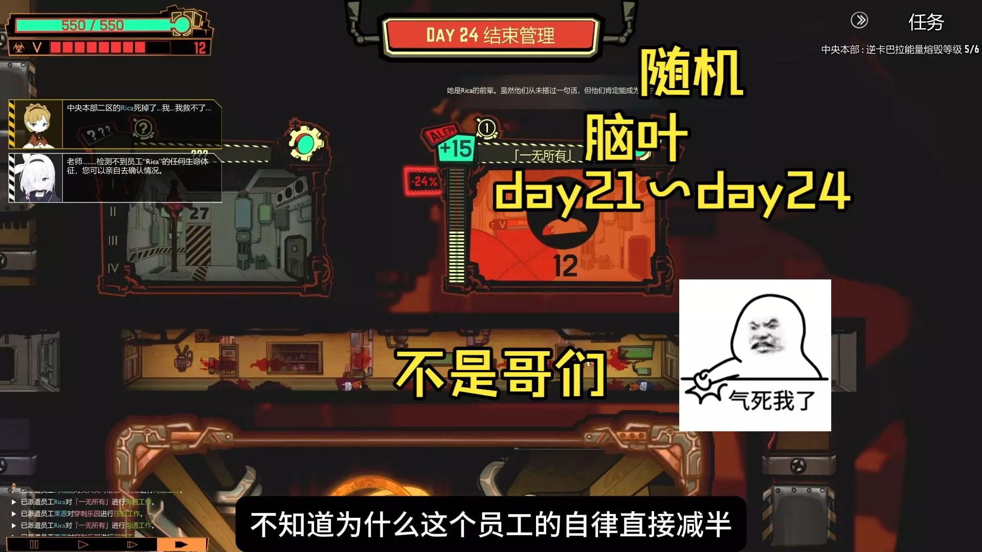 这是《脑叶公司》随机模组的第六天游戏内容,画面展示了控制部、情报部的异想体与员工配置,玩家进行员工指派、应对考验,还利用旧日罪影刷属性,当前处于黎明考验等级,任务为击败“黄昏”考验。
