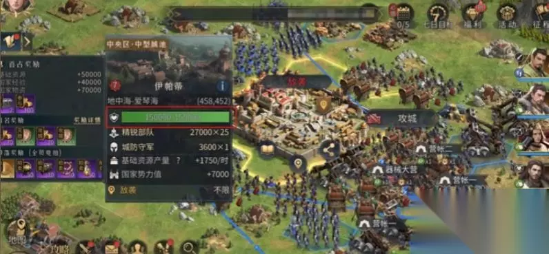 在游戏中,每一个城池都有其对应的“攻城值”,也就是城池血量,玩家可以通过升级等等手段提升城池“攻城值”,也相应的,每一个部队都会有自己的攻城值,但非常稀少。因此,在攻城之前,我们需要集结攻城装备,如投石机,攻城锤等,部分国家也会有不同的攻城方式,比如波斯文明的“火攻”,大不列颠文明的“破城”。