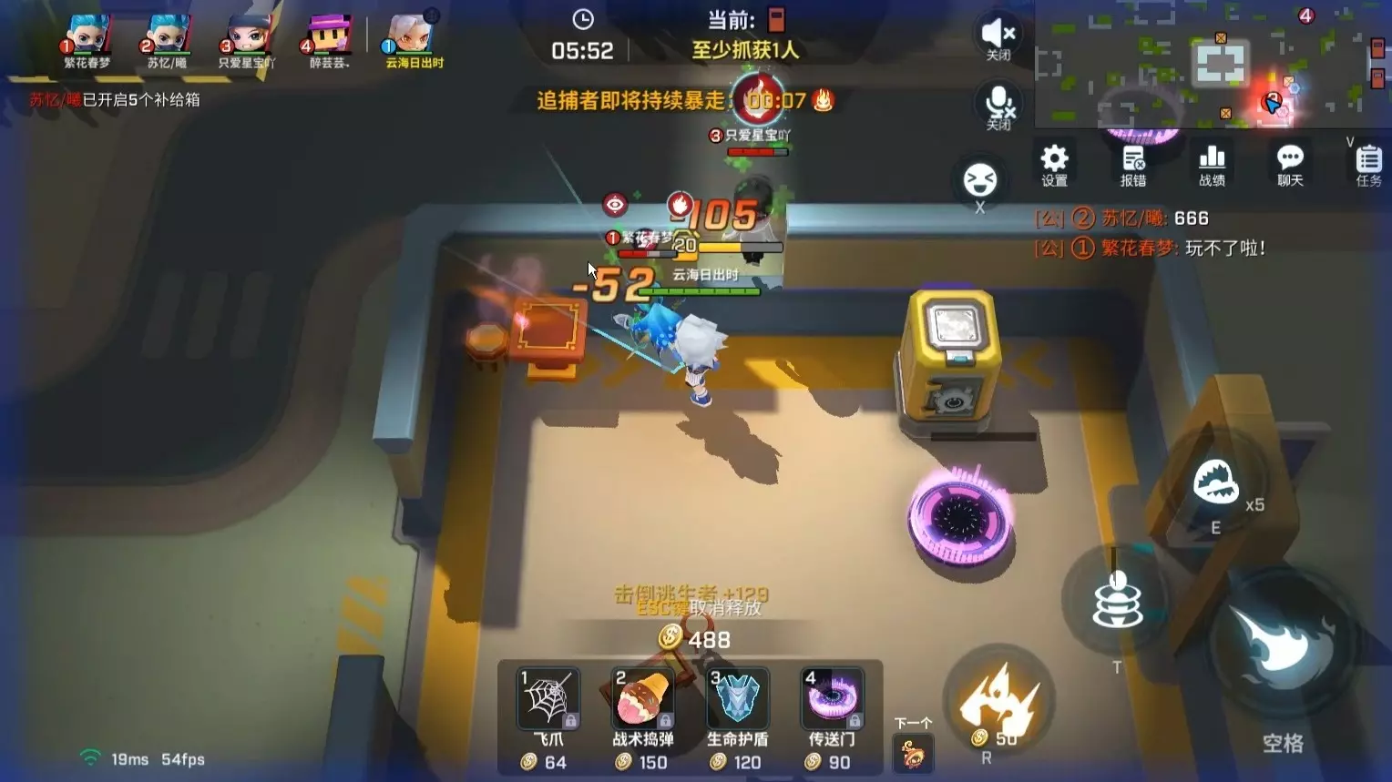 这是《逃跑吧!少年》的游戏对局内容,玩家操控角色“坏蛋头头”在抓捕者阵营,使用传送门等道具,对局中已有两名逃生者被淘汰,正处于持续暴走状态,目标是完成至少抓获1人的任务。