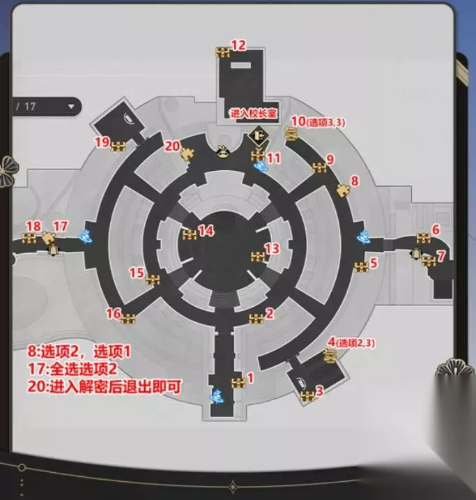 这里有几个比较特殊的宝箱: 编号8位置的宝箱需要完成对话选项次啊能拿到。 编号17的宝箱对话需要全都选择选项2,完成对话后获得。