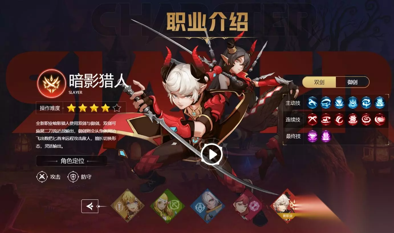 五、暗影猎人 职业介绍:新职业暗影猎手是一个输出型职业,可用于近战战斗和远程攻击。它可以攻击和防御。它有两种武器:一把剑和一把双剑。剑可用于远程攻击,双剑可用于近战。四种转职分别是影刃、劫炎、幽冥、暗月。前两种转职武器是双剑,后两种转职武器是剑。 选择建议:由于操作有一定难度,不建议新手玩家使用。