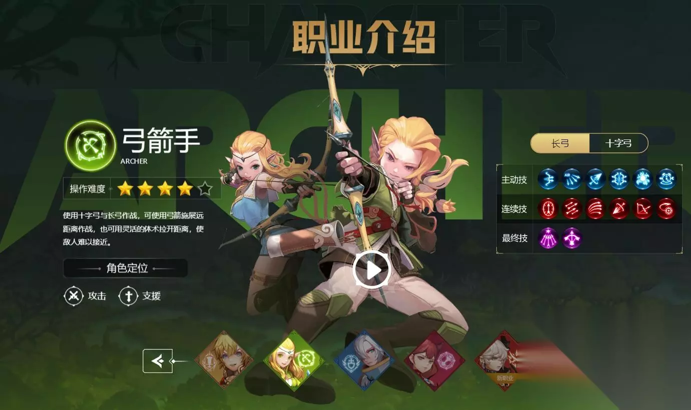 二、弓箭手 职业介绍: 一个可以攻击也可以支援的远程攻击职业。由于武器是长弓和弩,想要玩好这个职业就需要配合玩家灵活的操作,让对手更难近身。转职的四种类型分别是狙击灵、魔羽、影舞者和风行者。前两次转职的武器是长弓,后两次转职的武器是短弓。 选择建议:因为最大化弓箭手的作用需要玩家有熟练的操作,所以不建议新手玩家使用。
