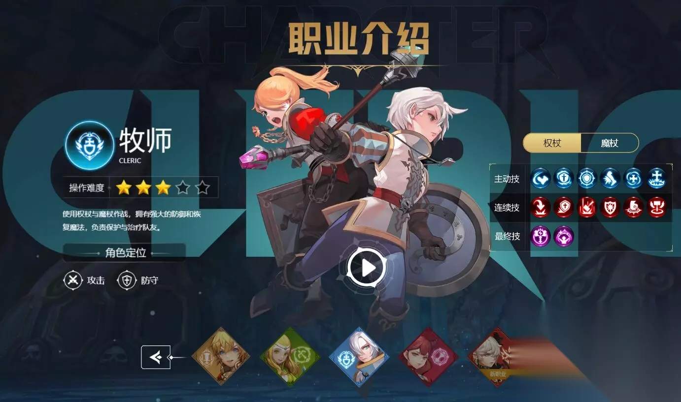 三、牧师 职业介绍:奶妈型职业不仅具有防御技能,可以护理队友,还具有一定的攻击技能。武器是魔杖和权杖。转职的四种类型分别是圣骑士、十字军、圣斗士和雷神。前两次转职的武器是魔杖,后两次转职的武器是权杖。 选择建议:操作难度既不太容易也不太高,新手玩家也可以选择。