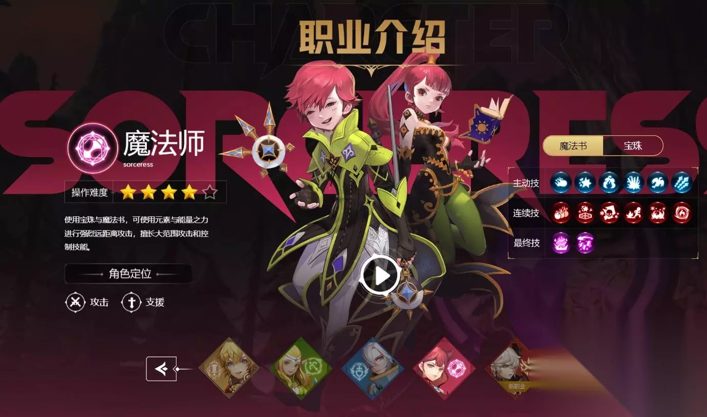 四、魔法师 职业介绍:远程攻击职业,可以攻击也可以支援。适合大规模攻击。它还具有控制技能。玩家可以使用元素和能力来攻击对手。武器是魔杖和球体。转职的四种类型分别是冰灵、火舞、黑暗女王和时间领主。前两个转职武器是魔杖,最后两个转职武器是宝珠。 选择建议:操作难度较大,不建议新手玩家使用。