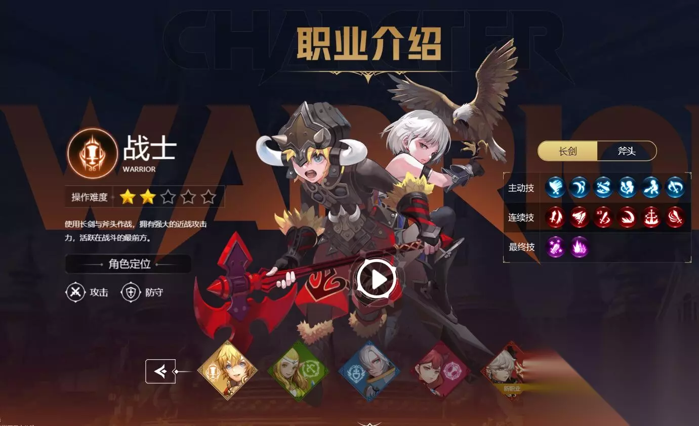 《龙之谷》世界即将开启公测。新玩家开始的时候,最重要的就是选择职业。除了战士、弓箭手、牧师、魔法师四大经典职业外,游戏还新增了暗影猎手这一新职业。这五个职业各有不同的定位和特点。如果您想了解更多,不妨阅读以下内容。 一、战士 职业介绍:近战输出职业,可攻可守。武器有斧头和长剑。共有四种转职职业可供玩家选择,分别是剑王、月领主、狂战士和毁灭者。前两次转职的武器是长剑,后两次转职的武器是斧头。 选择建议:由于操作难度比较小,适合新手玩家选择。