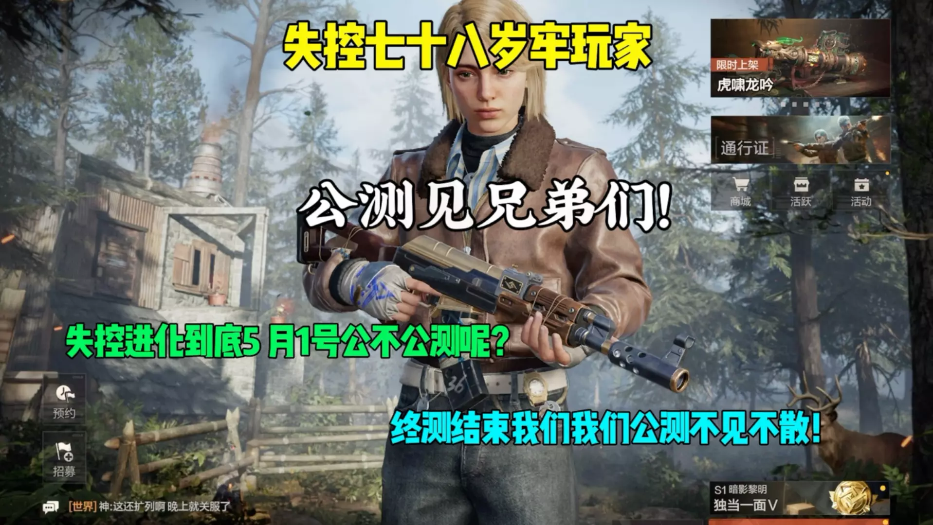 这是游戏《失控进化》的社区截图,展示了游戏内世界频道玩家留言,众多玩家留言“公测见”,还有玩家分享游戏兑换码、招募队友,可见玩家对该游戏公测的期待。