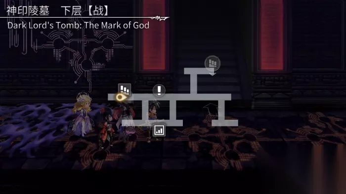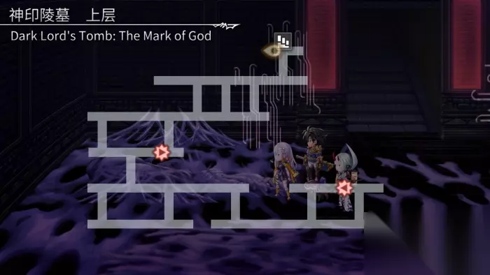 1、沿途前进,在地图左方触发剧情,击败伊修格迪迪(Lv.91)+骸泥异形(Lv.91)。 ※本层魔眼交叉处为陷阱。此处事件遇敌,并触发陵墓的诅咒,在此次战斗中为队友带来随机负面状态,请小心规避两处魔眼眼珠方向相交叉的位置。行走到一处魔眼面前转弯不会触发陷阱遇敌事件。 2、继续前进,在地图左方触发剧情,切换至黑暗空间。 3、一直向左走,触发剧情,返回现实世界。 4、从地图左上方路口进入“上层”。 上层