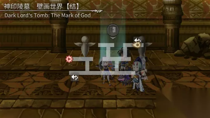 1、在地图左下方和右下方分别取得两块石板。 2、返回地图中央将石板拼回壁画,打开艾米路线的通路。 3、切换至艾米队伍。 壁画的世界【始】 通过祭坛旁边的传送阵传送至“壁画的世界【战】”。 壁画的世界【战】