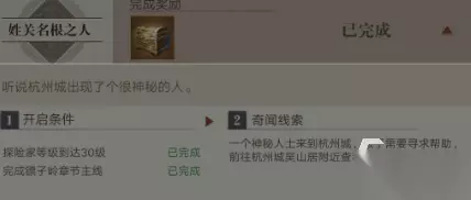 完成中主线后会触发一个剧情,剧情中会有一个神秘人士来到杭州城中,需要去找到它然后与其对话,对话可以得知它需要帮助,之后需要跟着他去完成协助任务,我拿出后可以获得一个坐标,前往该坐标轴查看就能拿到第二条线索了。